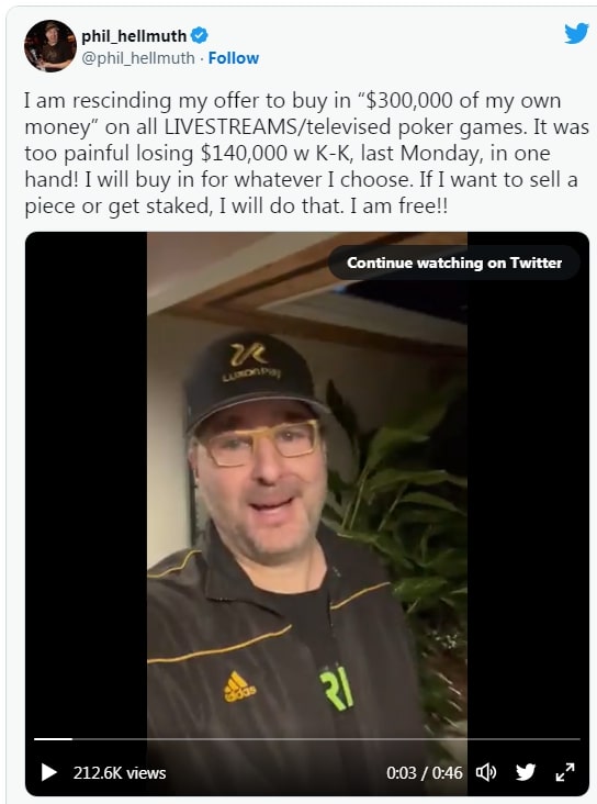 显然,HCL和LATB的连场失利让高傲的Hellmuth备受打击,其实这两场35万刀的损失对他的资金影响很小,我们只能理解为这个2.01米的大高个真是“能屈能伸”。