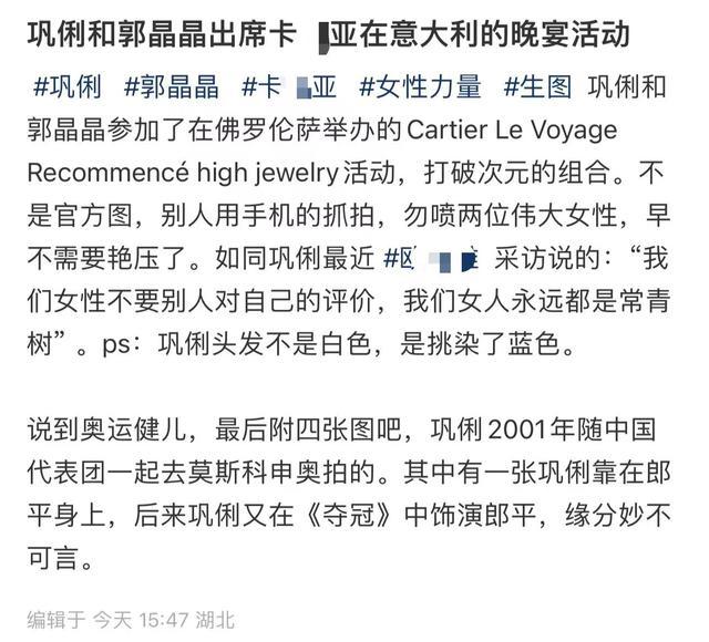 5月25日,有网友晒出一组照片,曝光郭晶晶和巩俐打破次元壁,在意大利佛罗伦萨一起参加某奢侈品晚宴的画面,引发持续热议。