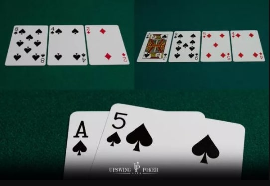 为了说明这一点,我们假设翻牌是Q♠5♦4♦,转牌是一张T♥。