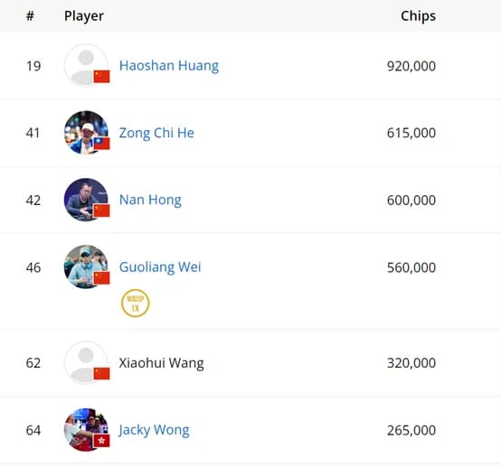 这天共有147名选手回到赛场,最终有17人晋级,中国选手Dong Chen排在筹码第三位。