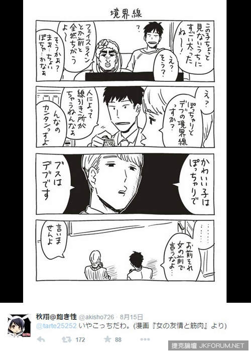 雖然很不想拿我們喜歡的渡邊直美當例子,但要臉蛋漂亮的胖胖女~我也只立刻想到直美醬惹ww(苦笑)如此簡單明瞭的「肉&胖比較圖」一出,果然受到大部分網友的認同。只是也有網友提出了男生版的標準:「長相可愛就是肉肉女,長得醜就是胖胖女。」