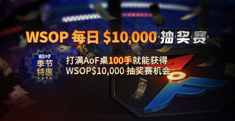 每天在全压或弃牌游戏中玩100手牌,你将会自动报名进入第二天开赛的WSOP每日$10,000抽奖赛(根据你的盲注级别会有不同的赛事) 同时你也可以在四个不同盲注级中别都玩上100手,届此获得够多抽奖赛的机会!