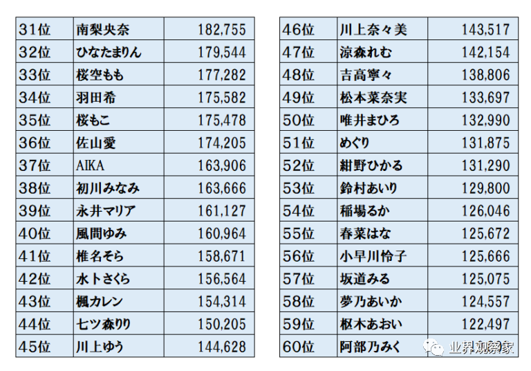深田咏美增长势头依旧不减,9月继续扩大对三上悠亚的领先优势,三上悠亚也加快了追赶脚步,本月跟混血模特藤田妮可合作的MV估计能够圈不少粉,深田咏美关注量的天花板到底在哪目前很难预测。相泽南恢复正常比赛节奏后关注度有点回暖,本月顺利突破30万大关,年内有望超越天使萌。