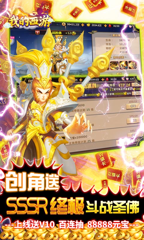 《我的西游》(送万元充值)是一款经典3D魔幻风战斗ARPG手游。 上线vip10,创角直送终极神将斗战圣佛、送万元充值卡,再送百连抽,SSR红卡登录一直送,超变态福·利领不停! 恢弘浩大的西游题材,炫目的全3D动作特效,畅快刺`激的逼真战斗,随心所欲的阵容搭配,炫酷霸气的神兵系统,绝对公平的5v5PK斗法,将动作RPG与策略养成完美结合,带给你战斗手游的顶级体验!
